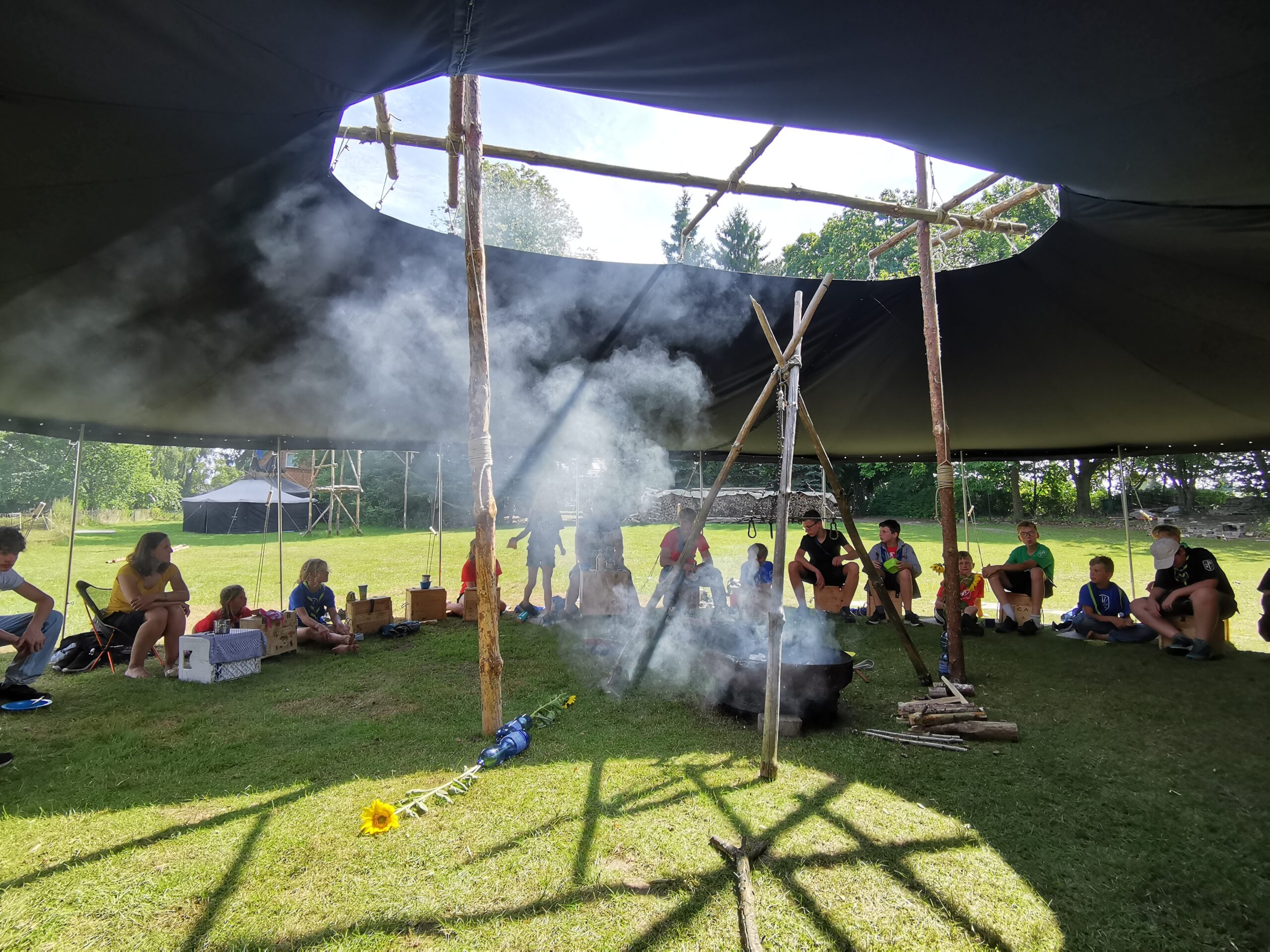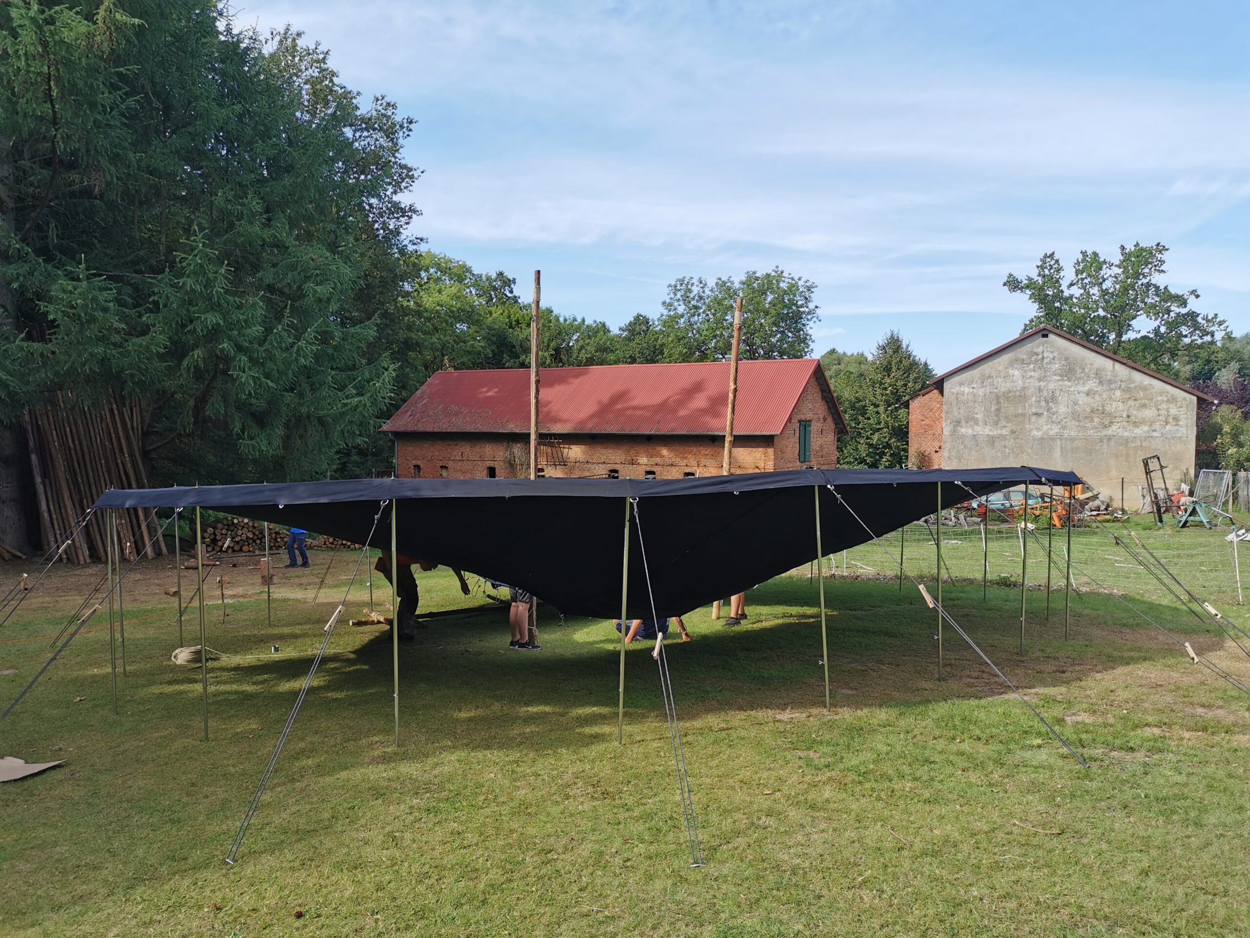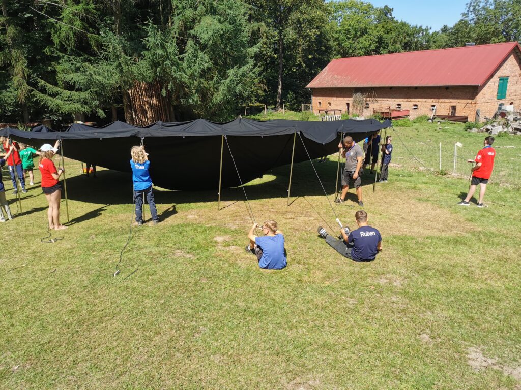 Die Kinder staunten nicht schlecht, als wir Mitarbeiter dann am Montagvormittag (Anreise war schon am Sonntag) die großen und schweren Pakete anbrachten. Wir ließen uns viel Zeit und zelebrierten das Entpacken des nagelneuen Schwarz-Materials. Alle Kinder durften man an dem neuen Zelt schnuppern. Dann machten wir uns mit den älteren Pfadis ans Aufbauen. Dafür brauchten wir etwas Zeit, denn so eine Jurte hatte auch ich bis dato noch nie aufgebaut. Doch nach etwa 2h stand das Dach. Da wir wirklich heißes Wetter hatten, ließen wir die Seitenwände weg. Doch durch die Größe des Daches konnten alle 35 Kinder und 7 Ma’s während der Mahlzeiten im Schatten sitzen. Ein HERZLICHES DANKESCHÖN noch einmal an dieser Stelle!