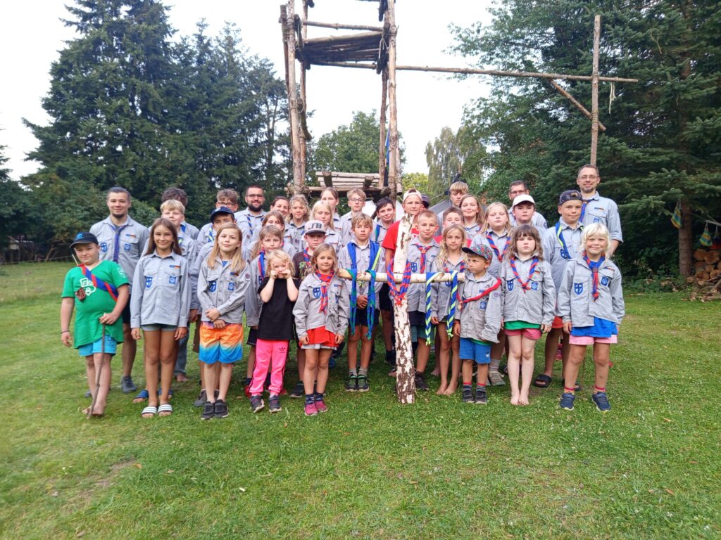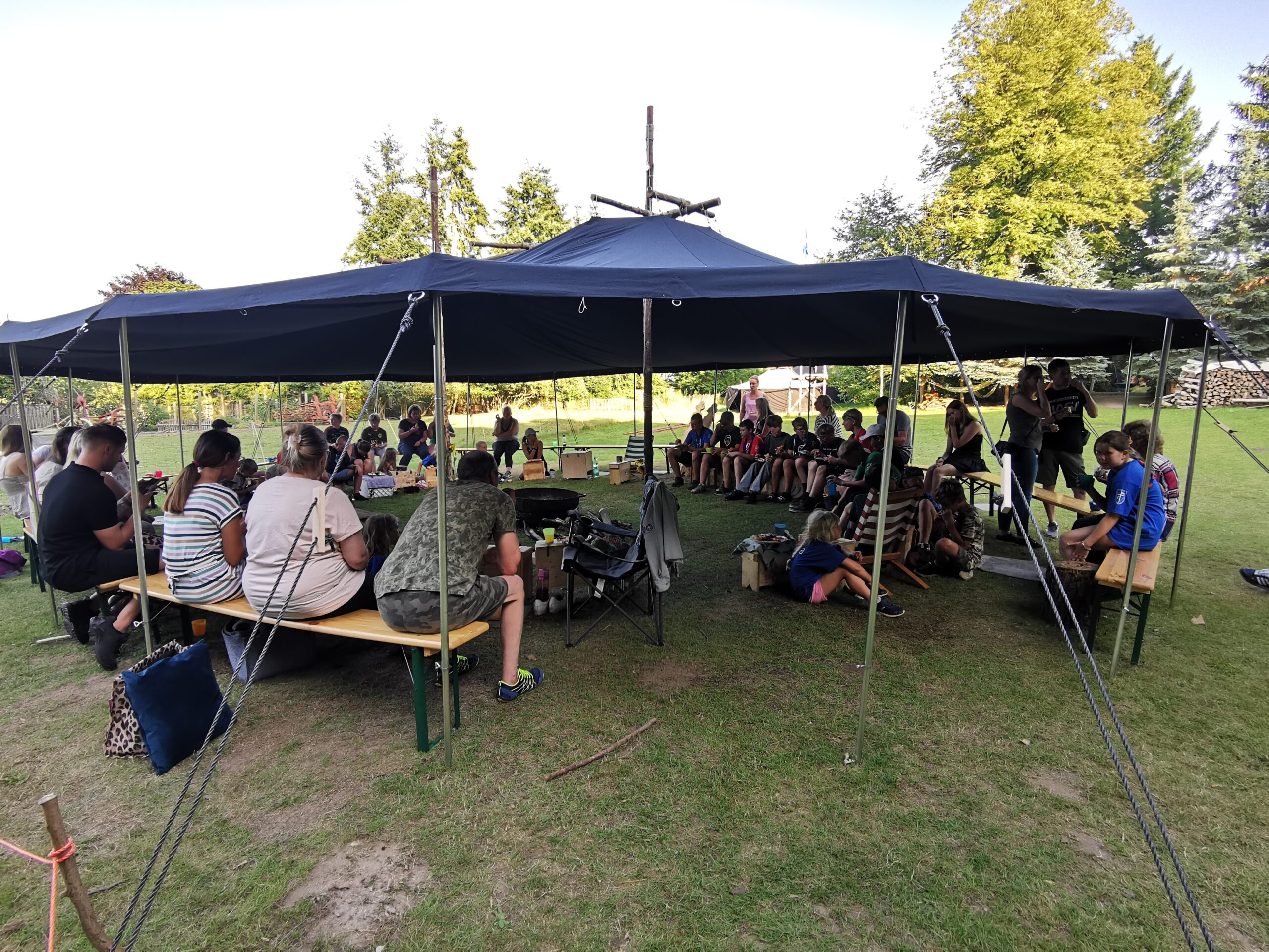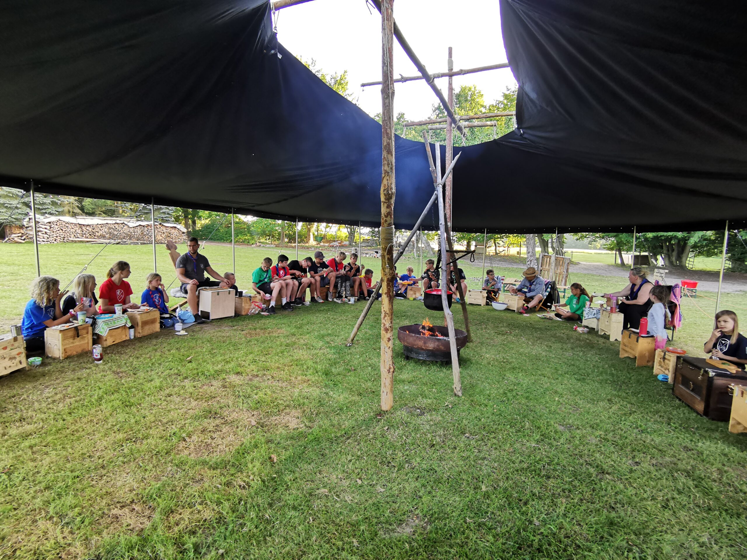 Die Kinder staunten nicht schlecht, als wir Mitarbeiter dann am Montagvormittag (Anreise war schon am Sonntag) die großen und schweren Pakete anbrachten. Wir ließen uns viel Zeit und zelebrierten das Entpacken des nagelneuen Schwarz-Materials. Alle Kinder durften man an dem neuen Zelt schnuppern. Dann machten wir uns mit den älteren Pfadis ans Aufbauen. Dafür brauchten wir etwas Zeit, denn so eine Jurte hatte auch ich bis dato noch nie aufgebaut. Doch nach etwa 2h stand das Dach. Da wir wirklich heißes Wetter hatten, ließen wir die Seitenwände weg. Doch durch die Größe des Daches konnten alle 35 Kinder und 7 Ma’s während der Mahlzeiten im Schatten sitzen. Ein HERZLICHES DANKESCHÖN noch einmal an dieser Stelle!